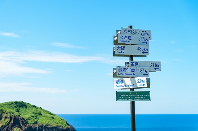 高台の駐車場から遊歩道を下っていくと、標識が立ち並ぶ広場が 。ここから二ツ亀と一緒に看板を収めれば、まるで海外のようなおしゃれな一枚が撮れますよ。足場が悪い場所もあるので、歩きやすい靴で行くのがおすすめです 。(両津港からクルマで約50分)