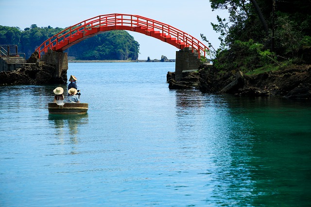 佐渡の南端付近に位置する「長者ヶ橋(ちょうじゃがばし)」は、もう一つの海の透明度を堪能できるスポットです。両津港からは車で約1時間と少し距離はありますが、たらい舟や宿根木で有名な南佐渡エリアにあるので、合わせて訪れるのがおすすめ 。入り組んだダイナミックな地形に架かる橋は迫力満点です 。橋の下の「深浦」という入り江の集落では、たらい舟で漁をする光景に出会えることも 。