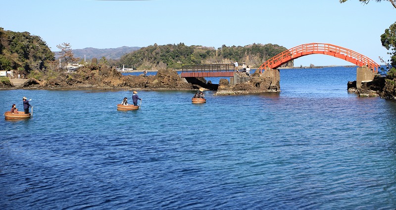 碧い海に浮かぶ、赤い橋とたらい舟は旅の想い出に